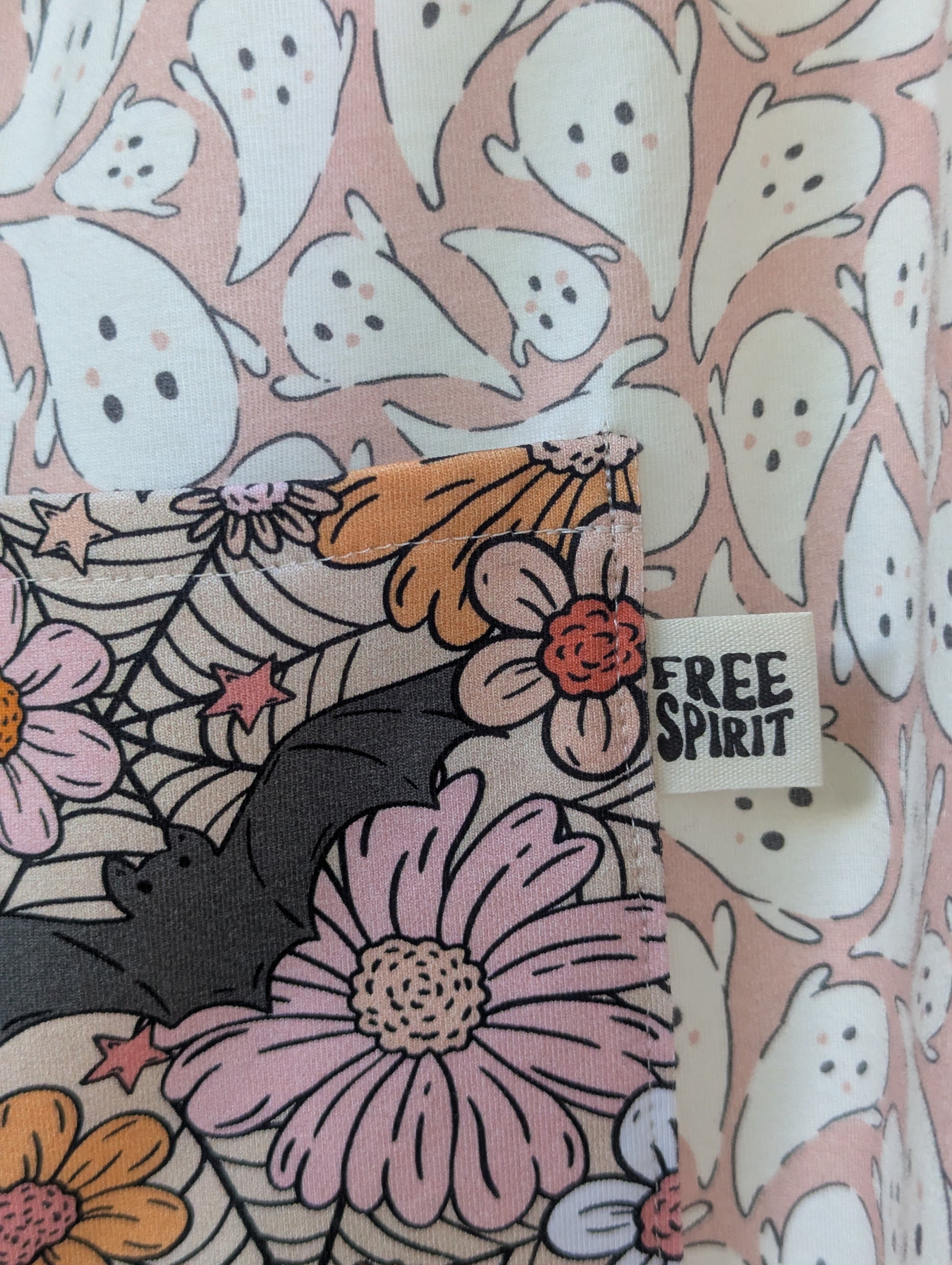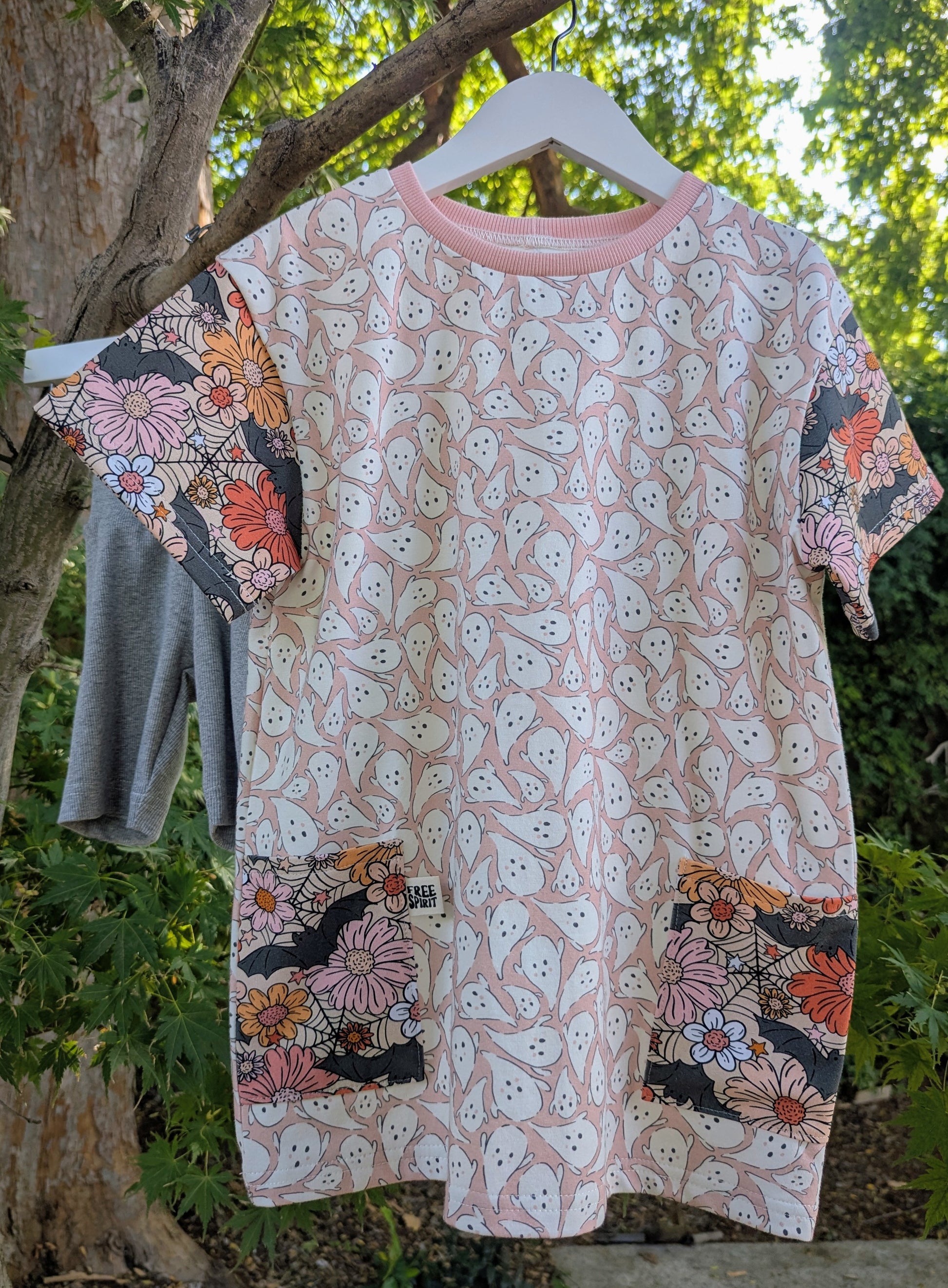 An oversized T-shirt dress with huge pockets perfect for carrying tricks, treats, and everything in between. Includes coordinating bike shorts (black with the Bats! print, grey with Spectors)