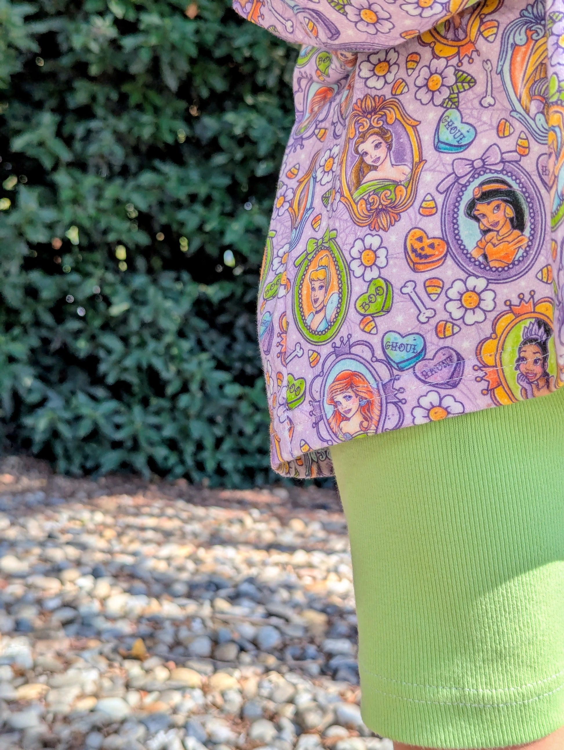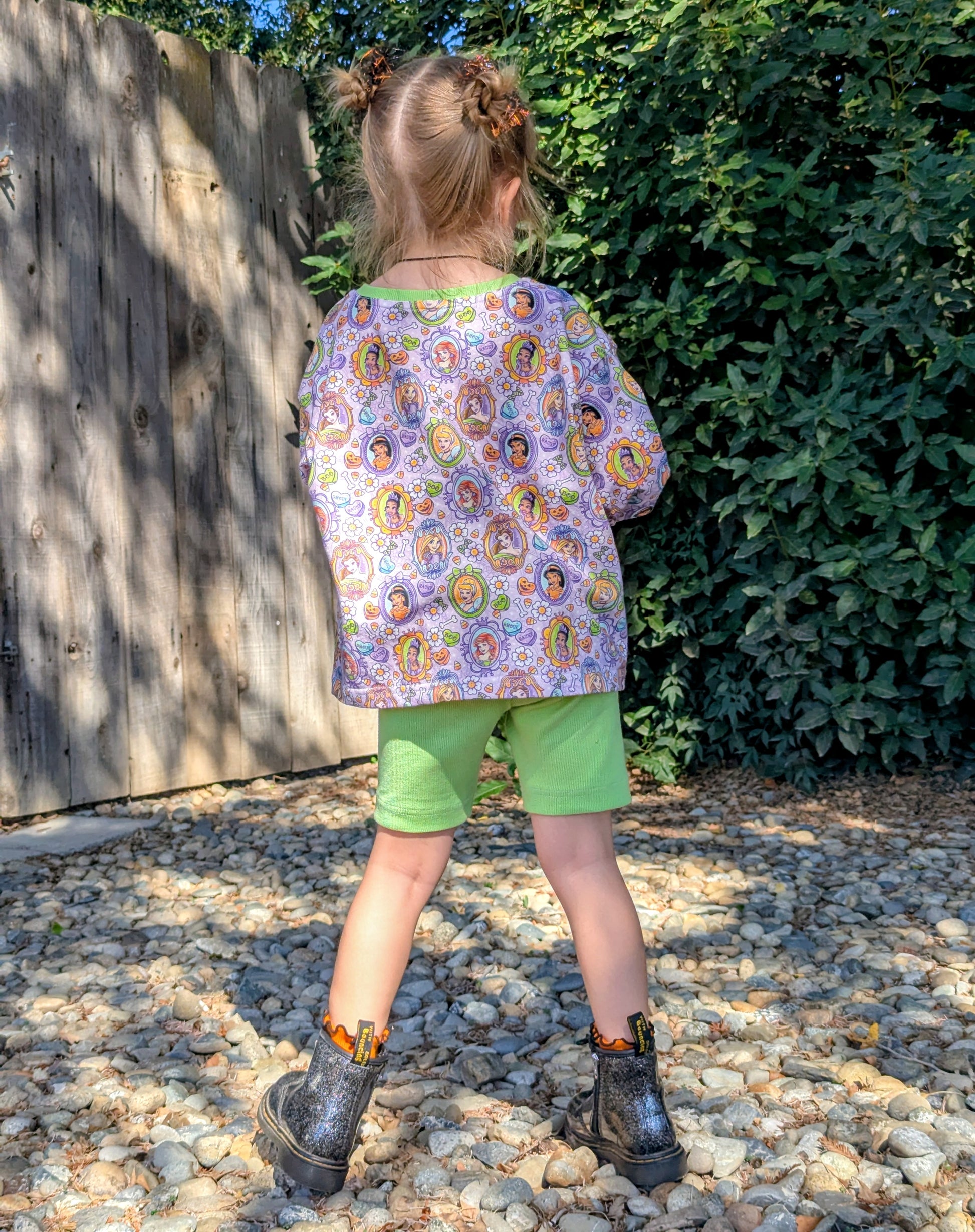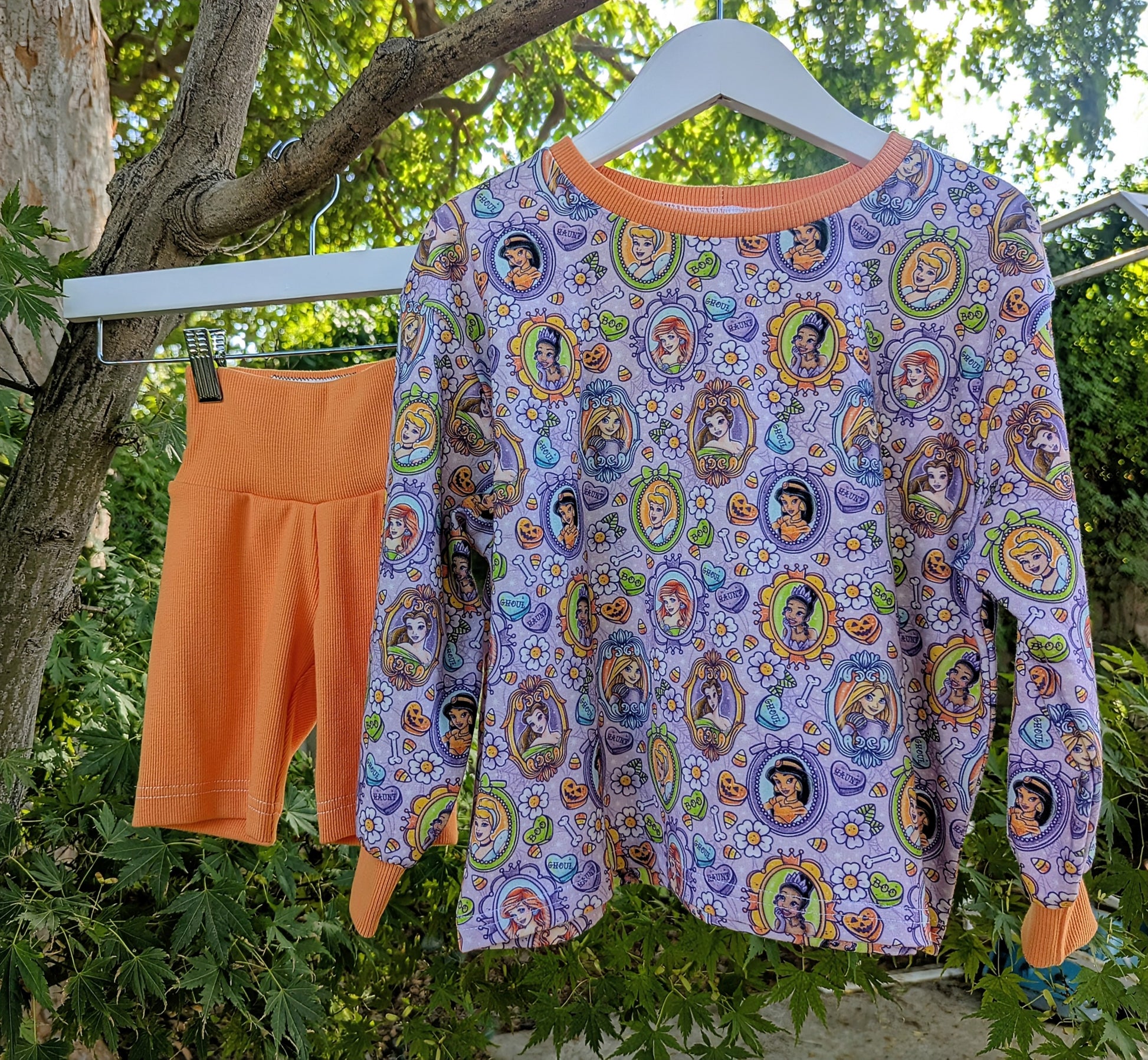 An long-sleeve oversized T-shirt and super-stretchy ribbed knit bike shorts, what more could a kid ask for? Shorts run a little big, shirt is intentionally oversized, size down if between sizes.