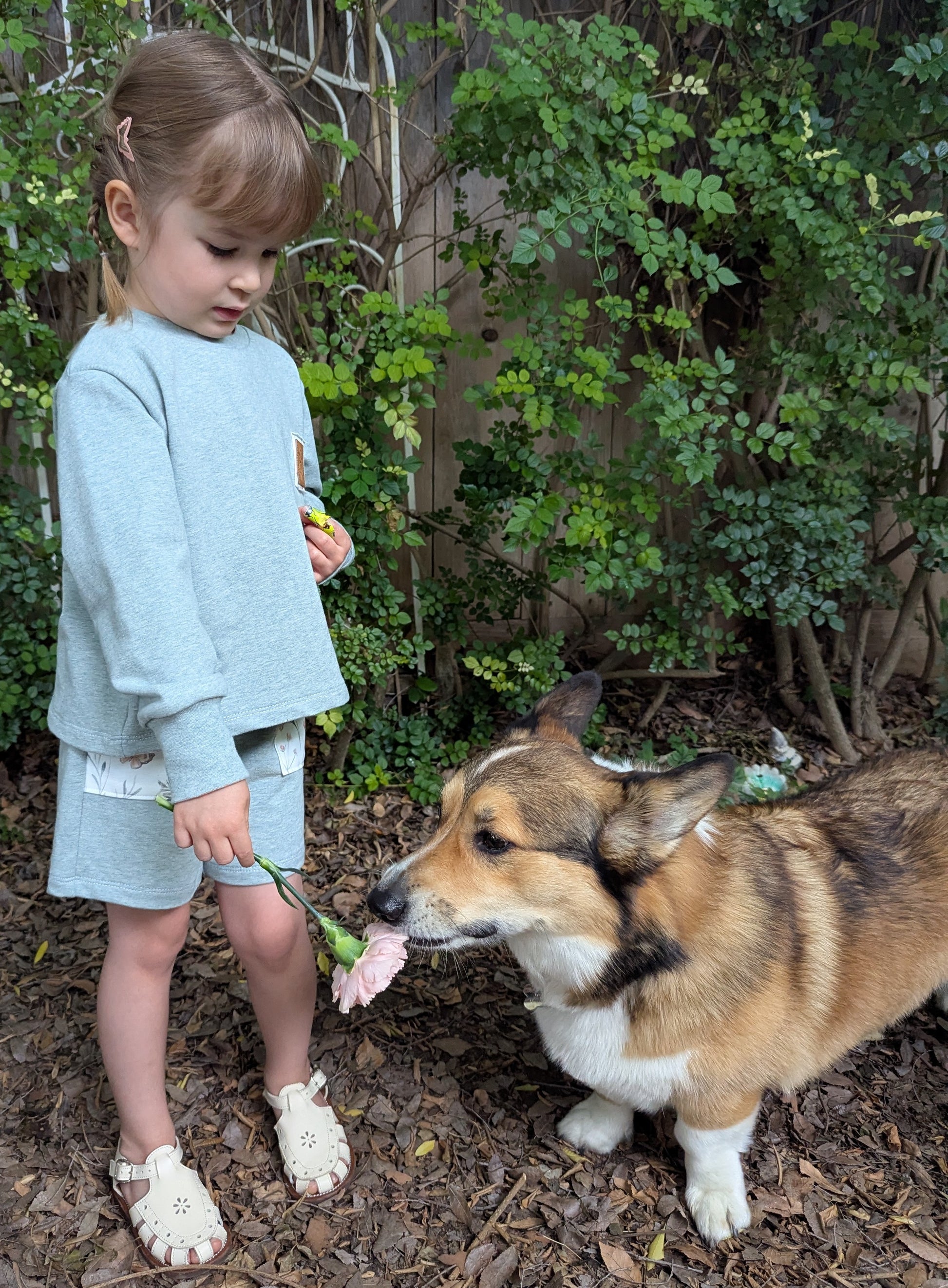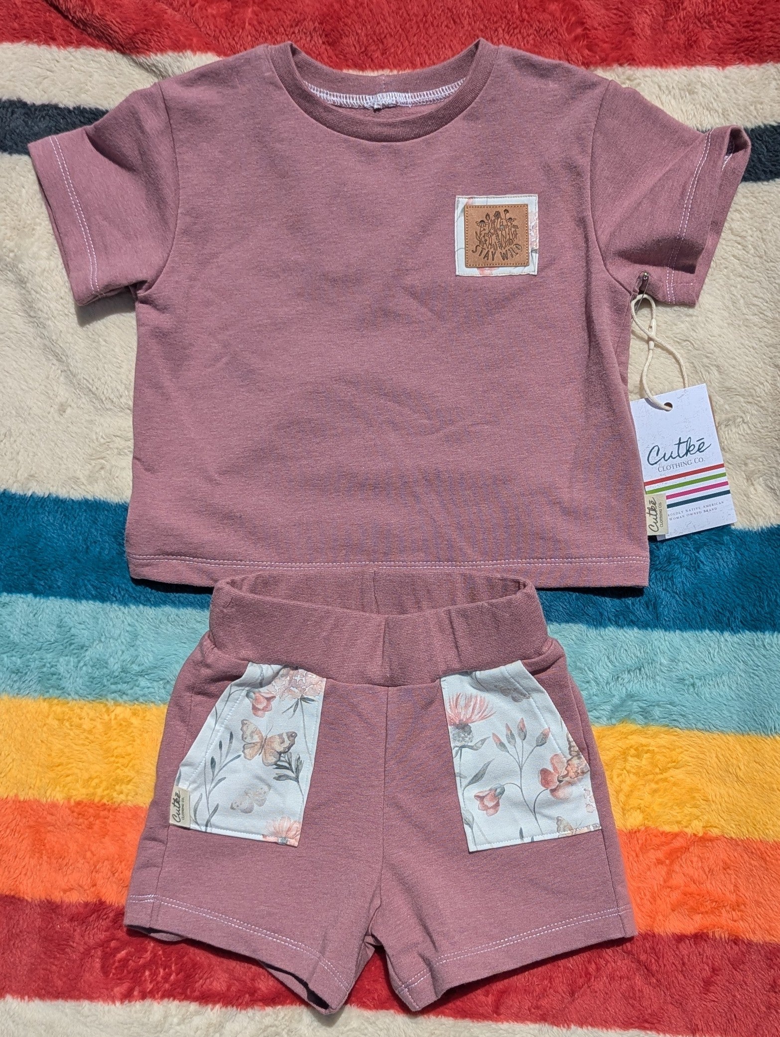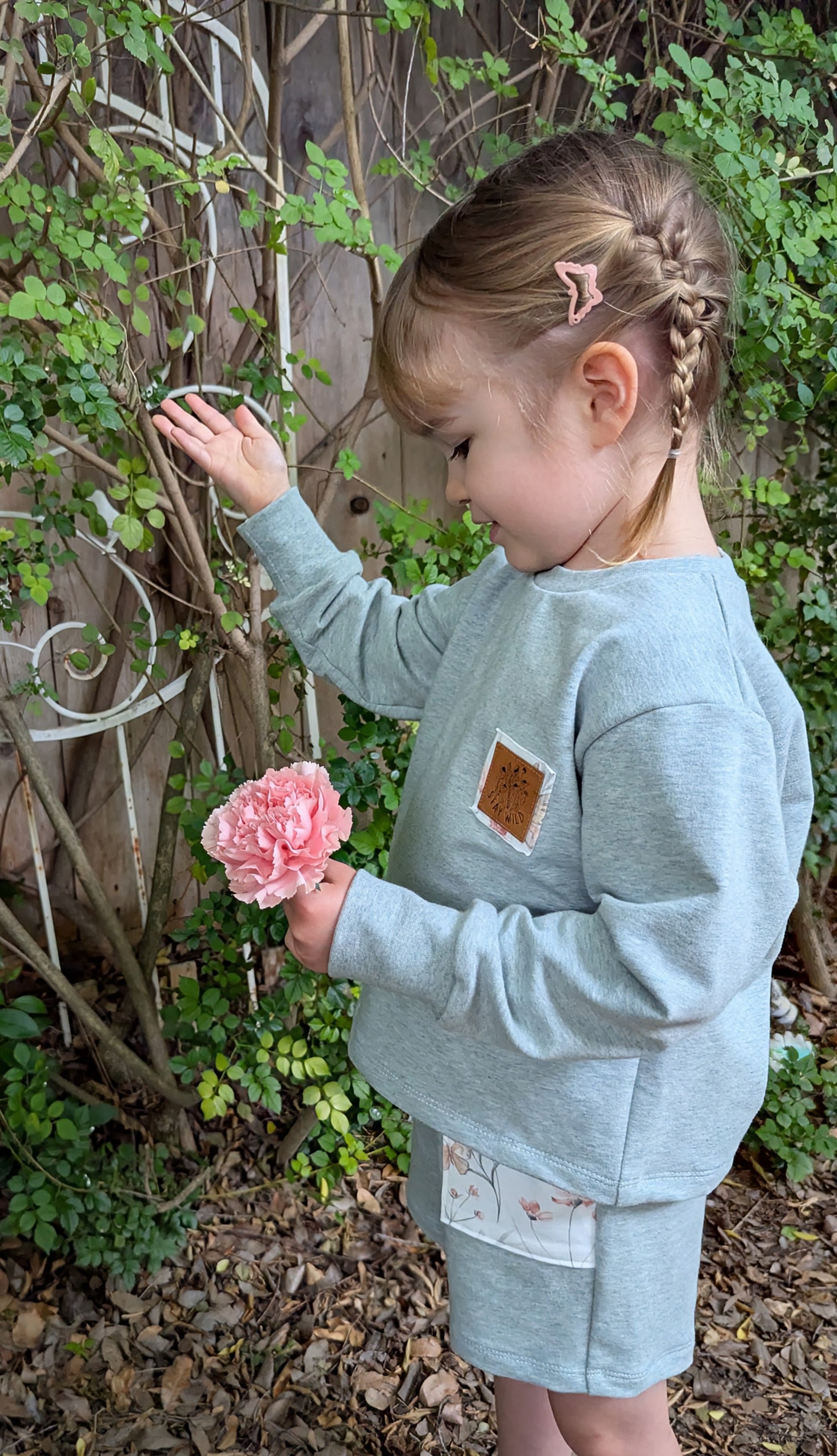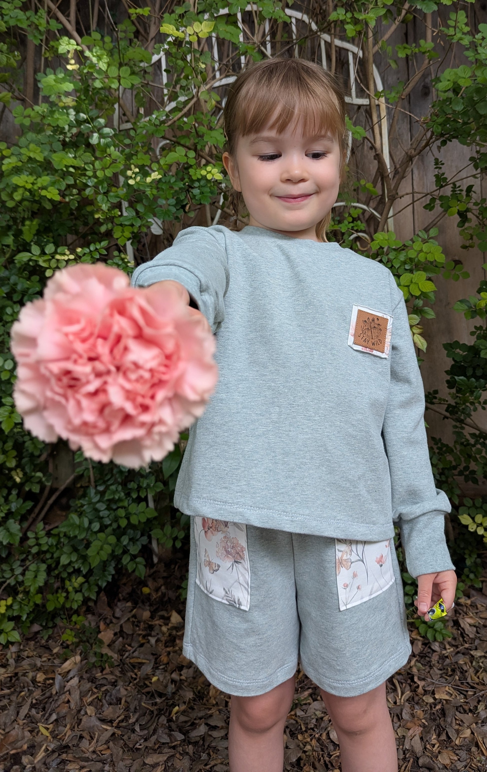 This super stylish sweatshirt and shorts set is perfect for the cooler mornings and warmer afternoons of spring and fall. Made from high quality cotton blend French Terry, it's as comfy as it is cute! The top is slightly cropped to show off the floral pockets, but still long enough to cover the belly.